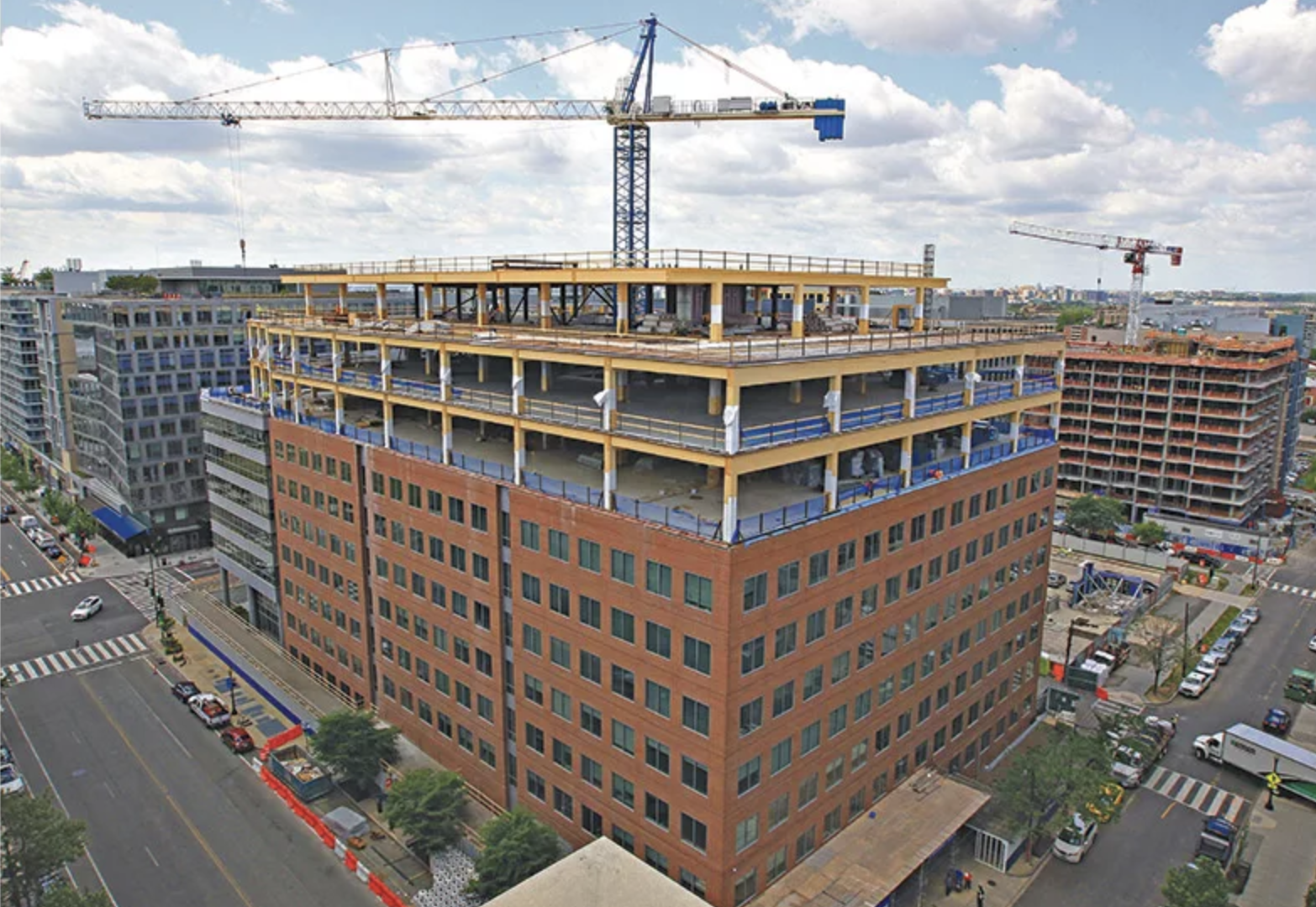 Capitalizing on unoptimized material placement won’t work with most buildings post-1990 - computer-optimized designs mean there’s less unintended extra capacity to work with. Fortunately, the surge in popularity of light-weight mass timber and engineered wood products can be leveraged to unlock vertical extensions with less added reinforcement. For example, the two storeys added to this office building in Washington, DC represent the first high-rise overbuild timber structure in North America. This project used steel to reinforce the core and is primarily composed of concrete-topped CLT floor cassettes.